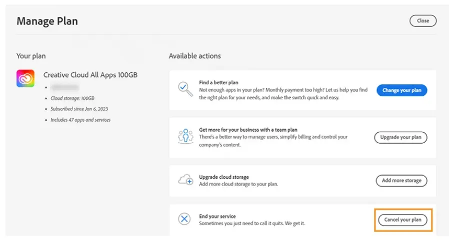 - 어도비 계정 페이지에 로그인하고, 플랜 관리를 선택하고, 내 플랜 취소를 선택합니다.